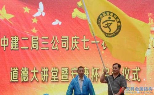 活動過程中,中建二局三公司十堰萬達項目部工地開展了慶“七一”農民工“三心”(自信心、責任心、進取心)道德教育,同時啟動了2015年“安康杯”活動。十堰市總工會對中建二局進行了授旗。