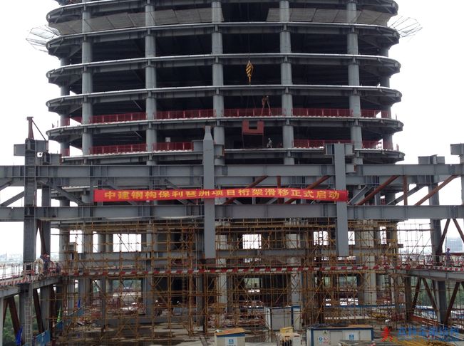 2015年6月24日,中建鋼構保利琶洲地塊四項目裙樓桁架層滑移正式啟動。裙樓滑移施工是本項目鋼結構的難點同時更是亮點,因此首次滑移請來了鋼結構行業的專家及質監站的領導前來參觀并指導。
