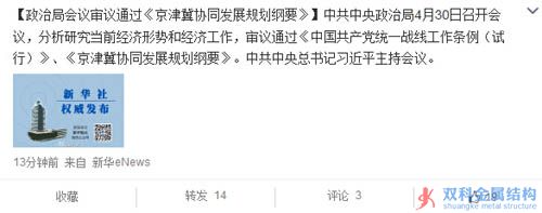 政治局會(huì)議審議通過《京津冀協(xié)同發(fā)展規(guī)劃綱要》